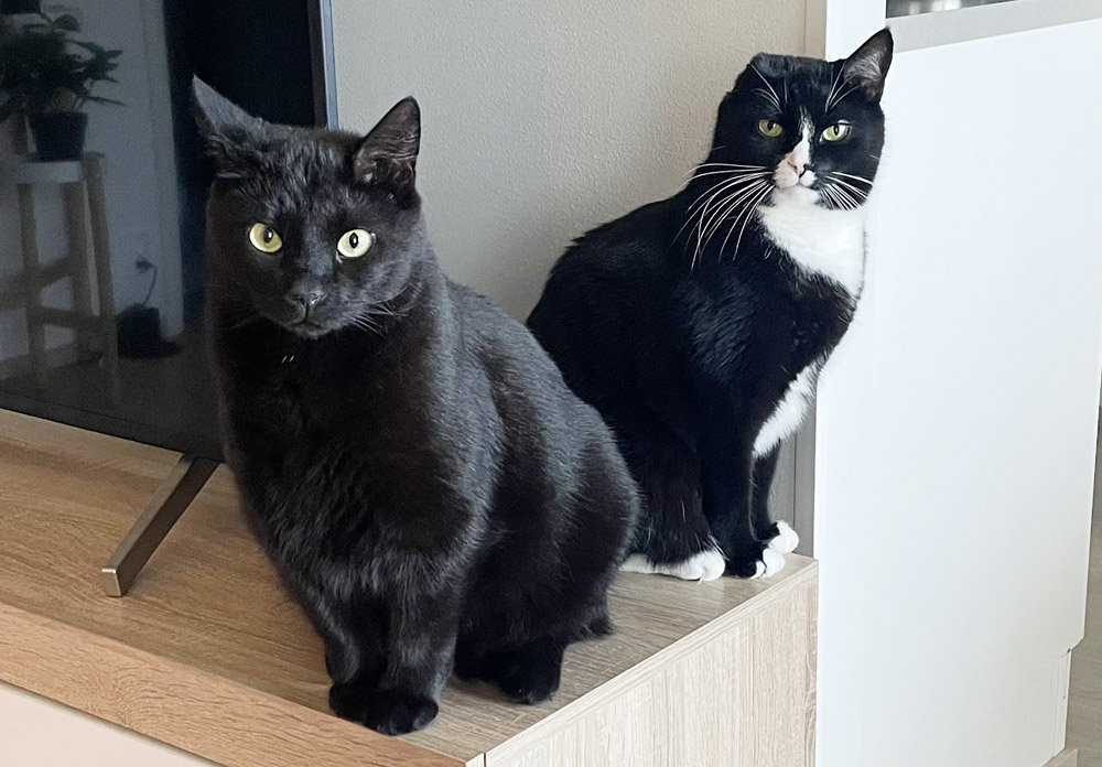 Molemmat on sisäkissoja, leikattu, rokotettu ja sirutettu. Koiriin nämä kissat eivät ole päässeet tutustumaan, mutta lapsiperhearjessa ovat olleet mukana. Selvästi kuitenkin viihtyvät rauhallisemmassa ympäristössä, jossa ei ole paljoa menoa ja meininkiä.  Sisäsiistejä, paitsi Vinski silloin, jos jossain on painopeitto tai säkkituoli. Mihinkään muualle vääriin paikkoihin ei ole tullut vahinkoja.